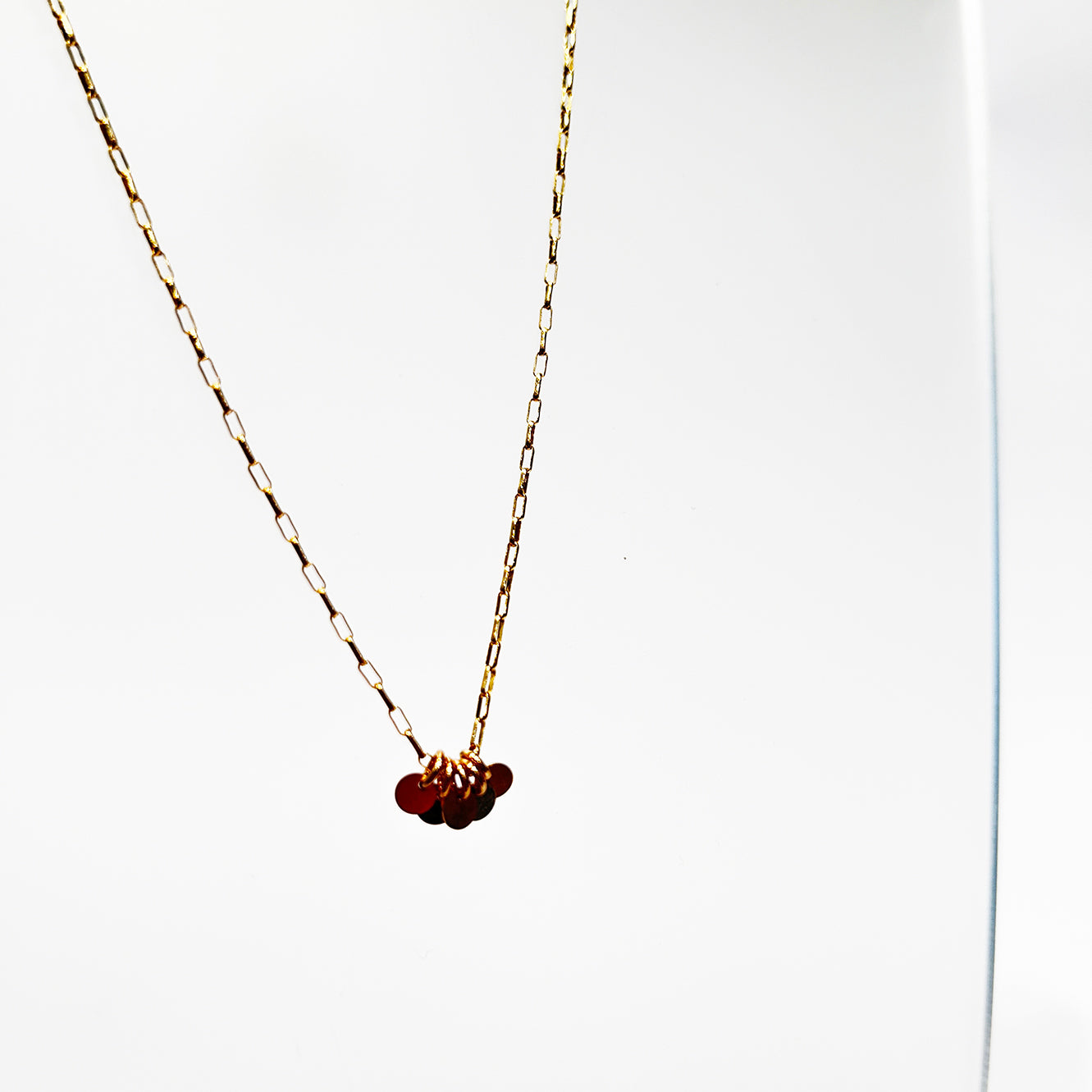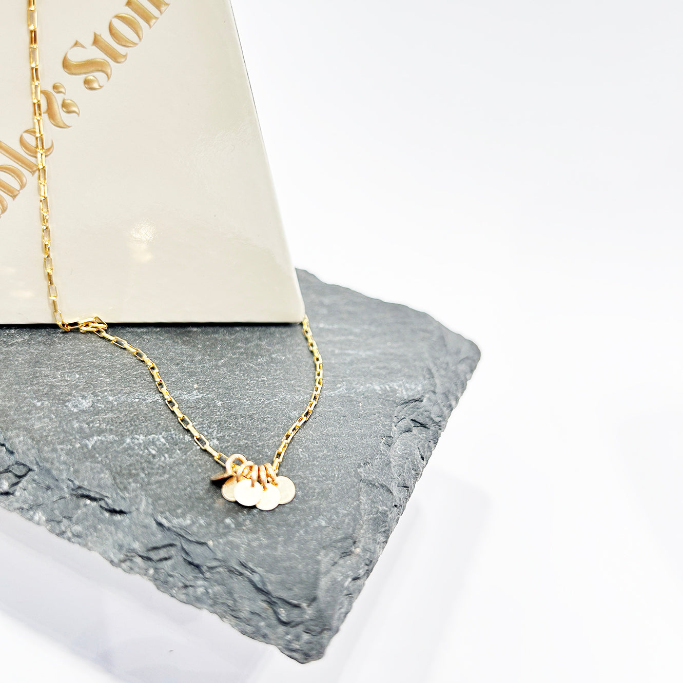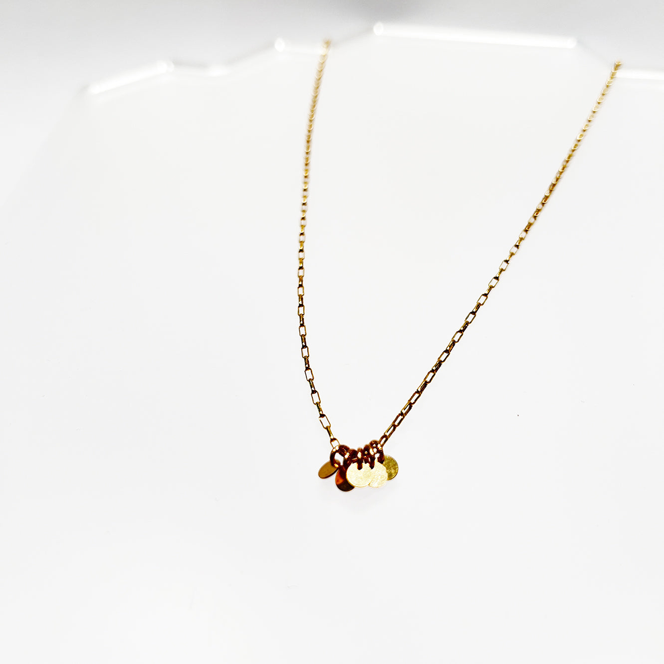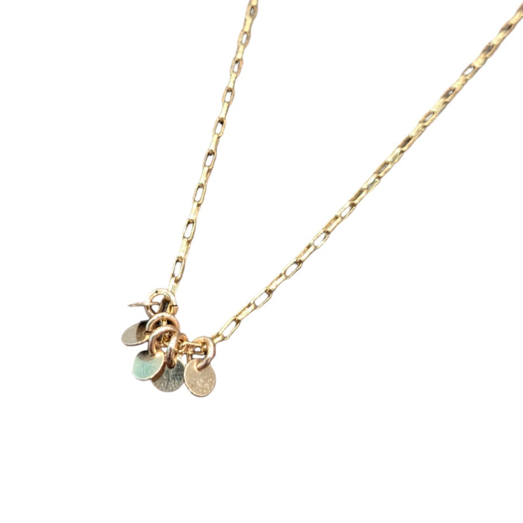 - a beautiful delicate chain in lux 14kt GoldFill featuring 5 tiny gold discs approx 4mm each