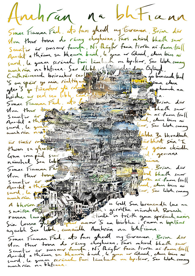 Across this detailed composition, the handwritten Irish-language lyrics of Amhrán na bhFiann sweep through the artwork in vibrant green, white, and gold — echoing the anthem’s spirit of courage, identity, and national pride.