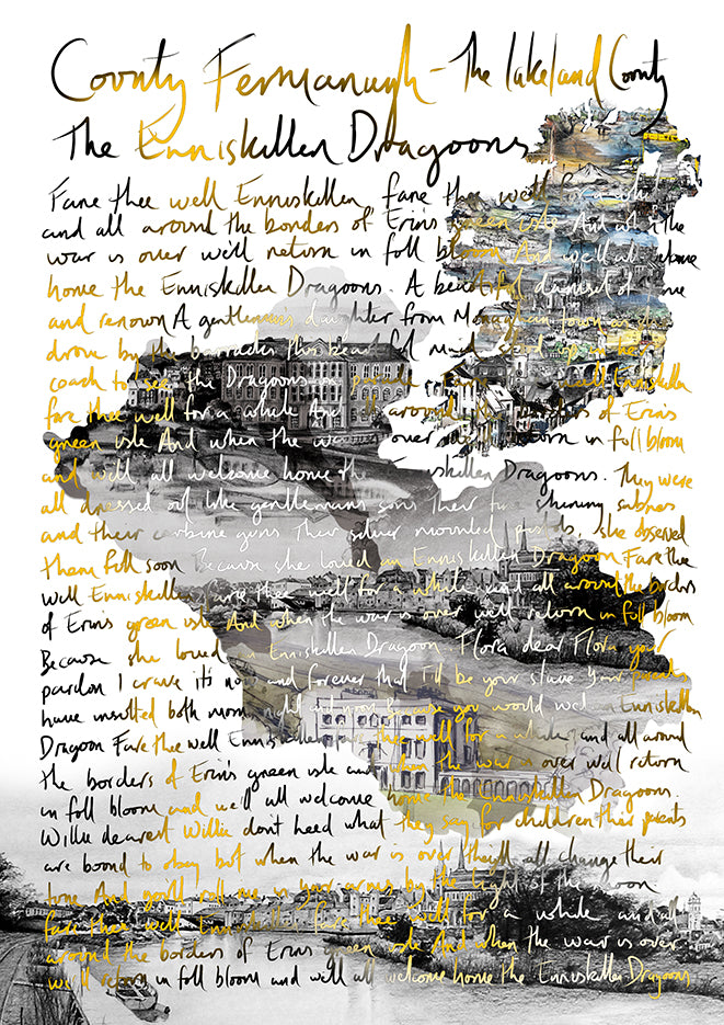 Stephen Farnan’s Fermanagh piece carries the proud history and melodic sweep of The Enniskillen Dragoons, a song deeply rooted in the waterways and regimental heritage of the county. Lough Erne’s island-dotted expanses, the winding shores, and the gentle rise of the surrounding landscape are captured in Stephen’s elegant line, giving the artwork a sense of calm, history, and timeless place.