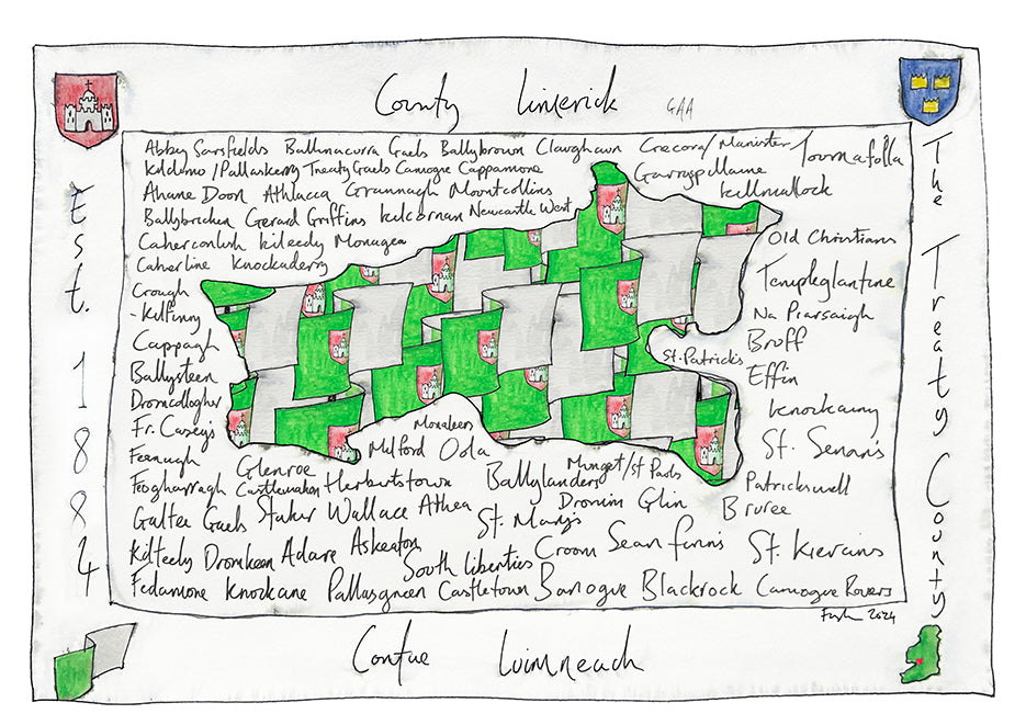 These sketches are part of a body of work by Stephen that focus on the 32 counties of Ireland. The GAA County Colours collection celebrates all the GAA clubs in each county. Our frames are black solid wood with simple clean edges. We frame in-house, which allows us to make sure every piece is perfect!