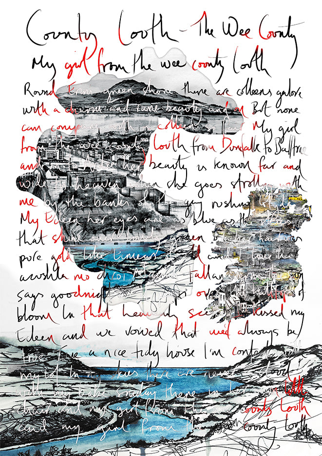 Stephen Farnan’s Louth piece captures the charm, affection, and lively spirit of My Girl From the Wee County Louth, a song that celebrates both love and place in equal measure. The county’s coastline, historic towns, and striking landscapes — from the Cooley Peninsula to the Boyne — are drawn in Stephen’s distinctive line, giving the artwork a bright sense of character and identity.