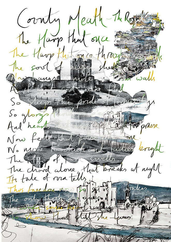 Stephen Farnan’s Meath piece draws deeply from the heritage and quiet grandeur of The Harp That Once Through Tara’s Halls, a song steeped in Ireland’s ancient history and poetic memory. The storied landscapes of Meath — from the Hill of Tara to its rolling fields and ancient earthworks — are captured in Stephen’s elegant line, offering a powerful sense of place rooted in myth and legacy.