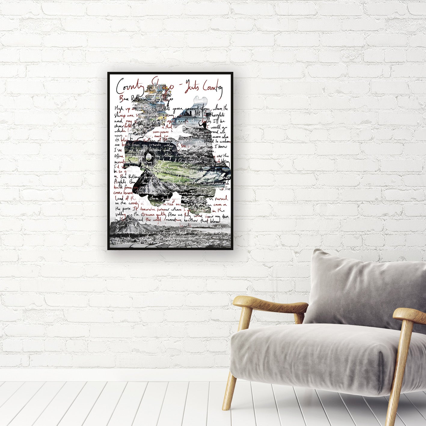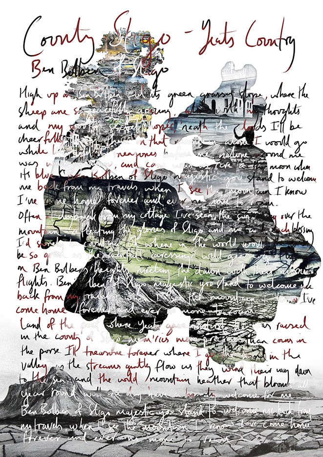 Stephen Farnan’s Sligo piece is shaped by the striking presence and mythic power of Ben Bulben of Sligo, a song that honours the county’s dramatic landscape and its deep connection to legend, poetry, and place. Sligo’s sweeping coastlines, calm lakes, and rugged mountains — crowned by the unmistakable silhouette of Ben Bulben — are drawn in Stephen’s expressive line, creating a scene rich with atmosphere and mystery.