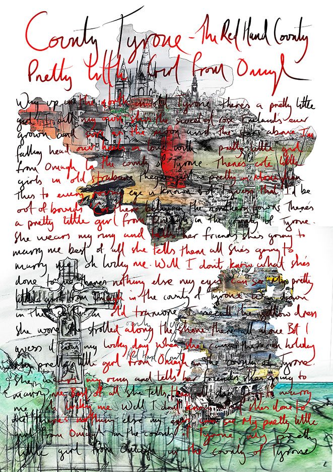 Stephen Farnan’s Tyrone piece captures the light-hearted charm and warm affection of Pretty Little Girl from Omagh, a song that celebrates both love and local pride in the heart of the county. Tyrone’s rolling hills, quiet valleys, market towns, and the rich landscapes surrounding Omagh are drawn in Stephen’s expressive line, giving the artwork a grounded and inviting sense of place.