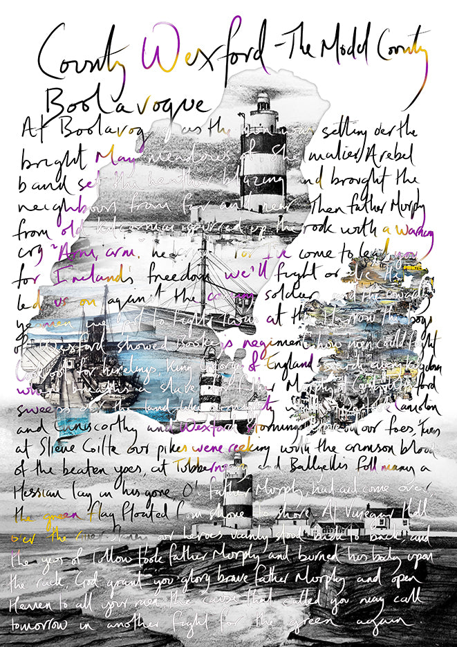 Stephen Farnan’s Wexford piece is infused with the courage, passion, and solemn pride of Boolavogue, a song forever linked with the historic events and enduring spirit of 1798. Wexford’s rich farmland, rolling hills, and storied towns — from Vinegar Hill to the quiet rural parishes — are drawn in Stephen’s powerful, expressive line, grounding the artwork firmly in the landscape that shaped the tale.