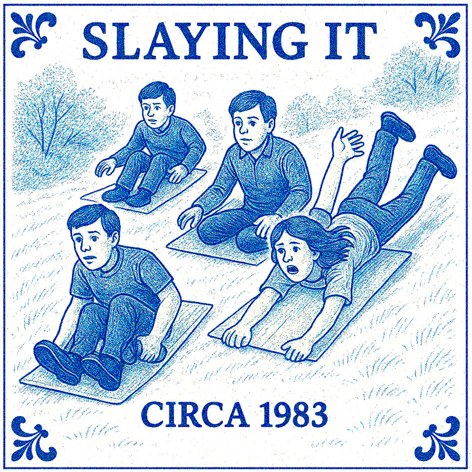 'Now, about the AI element. While every piece begins with a memory or sketch, this collection openly and playfully experiments with AI as part of the creative process, just to see what happens. Some of the slightly absurd results are part of the fun. Take “Slaying It” for example: a memory of sliding down a bank in Armagh on cardboard as a child, but with a girl sporting three arms, AI thought this was right, and I thought it was hilarious.